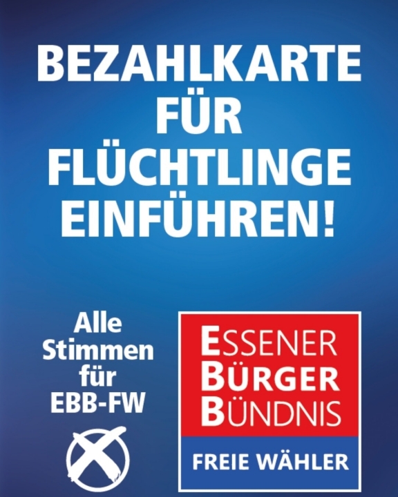 Das ESSENER BÜRGER-BÜNDNIS – Freie Wähler (EBB-FW) fordert die konsequente Einführung der Bezahlkarte für Geflüchtete auch in Essen. Die Fraktion hat hierzu einen Antrag in den Rat eingebracht, der vorsieht, keinen Gebrauch von der Opt-Out-Regelung der neuen NRW-Bezahlkartenverordnung zu machen. Damit sollen künftig Leistungen nach dem Asylbewerberleistungsgesetz grundsätzlich über eine Bezahlkarte erfolgen – sachgerecht, sicher und kontrollierbar.